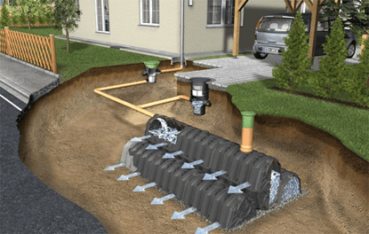 Bij kleinere capaciteiten genieten kunststof tanks de voorkeur. Is er sprake van hoge grondwaterstand dan kan een laag grind het opdrijven voorkomen. Voordeel daarvan is dat zo’n laag de ontwikkeling van micro-organismen, die verontreinigingen afbreken, stimuleert. De ruwe wanden van betonnen opslagtanks zorgen voor datzelfde effect.