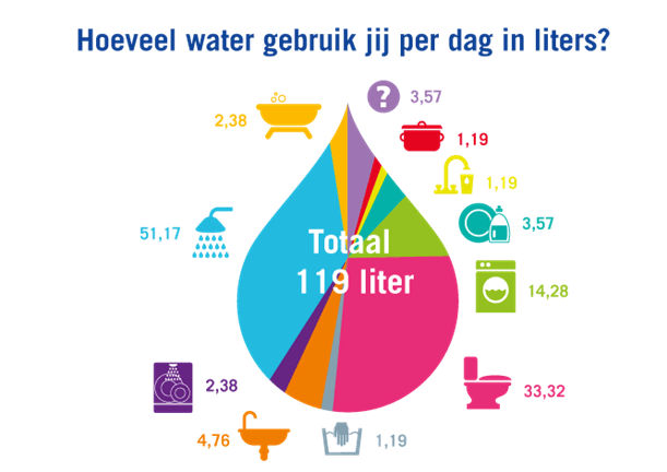 Huidige gebruik van drinkwater Momenteel gebruiken we in Nederland gemiddeld 120 liter drinkwater per persoon per dag (l/p/d). Het meest water gebruiken we voor de douche 51,2 l/p/d, voor het toilet 33,3 l/p/d en de wasmachine 14,3 l/p/d. Samen 98,8 l/p/d. Dat is 83 % van het totale drinkwater per persoon per dag.