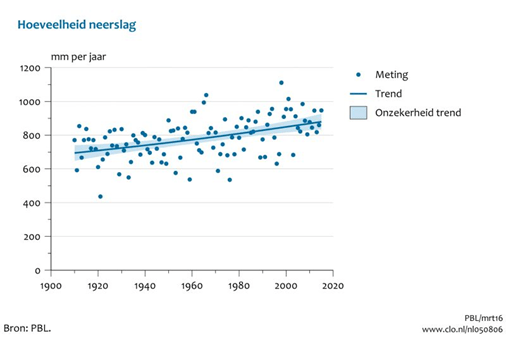 De jaarlijkse neerslagsom in Nederland is tussen 1910 en 2017 gelijkmatig gestegen van 690 naar 874 millimeter. Dit is 27% in 108 jaar. Langs de kust is de toename met 30 tot 35% (200 tot 250 mm) het grootst. Langs de oostgrens en in het zuidoosten is de toename wat minder groot 10 tot 25% (70 tot 170 mm).